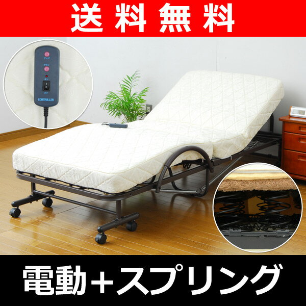 ●本体サイズ:幅98×奥行205×高さ49cm 重量46kg●材質:フレーム:スチール(粉体塗装)、マット中身:コイルスプリング、ウレタンフォーム、マット張地:ジャガード生地●原産国:中国●組立品です●組立時間:約20〜30分●折りたたみ時:幅98×奥行53×高さ111cm●マットサイズ:幅90×長さ198cm●マット面高さ:40cm●マット厚:12cm●消費電力:33W●リモコン付手元のリモコンを押すだけで、楽々リクライニング!ギアと違い、無段階のリクライニングで、あなた好みの角度に設定可能最初に背部が上がり、途中で連動して脚部が上昇※実際にはもっとゆっくりリクライニングボンネルコイルスプリングを使い、ウレタンのみのマットレスよりもヘタリに強い構造合計308個のボンネルコイルスプリング使用カバーには高級感あふれるジャガード織り使わない時は手元で電源を切れる安心構造簡単操作で楽々リクライニング今なら嬉しい専用ポケット付き!マットレスの下に人がもぐりこんだりすることを防ぐ安全ネットを装備ベッドが不意に折りたたまれたり、広がったりすることを防止するストッパーピンは左右2ヵ所に付属当社のベッドは、JIS基準に準じた強度試験を行っております。その結果から、目安として、一人用ベッド(シングル、セミダブル)について、静止した状態の荷重で約90kgにも耐えうる構造になっています。折りたたむと53cmと、とてもスリムになります来客時などに便利です「電動だから重くて大変・・・」と思いきや、意外と無理なく折りたたみ可能!モーターやスプリングで重量のある電動ベッドそれでもよりスムーズに折りたたみ作業をやっていただけるための3つの工夫折りたたみ補助のバネを従来の2本から4本に増量キャスターの直径を10mm大きくし、よりスムーズな動きを実現持ちやすいアーチ状のサイドガード※写真は色違のものを使用しています。